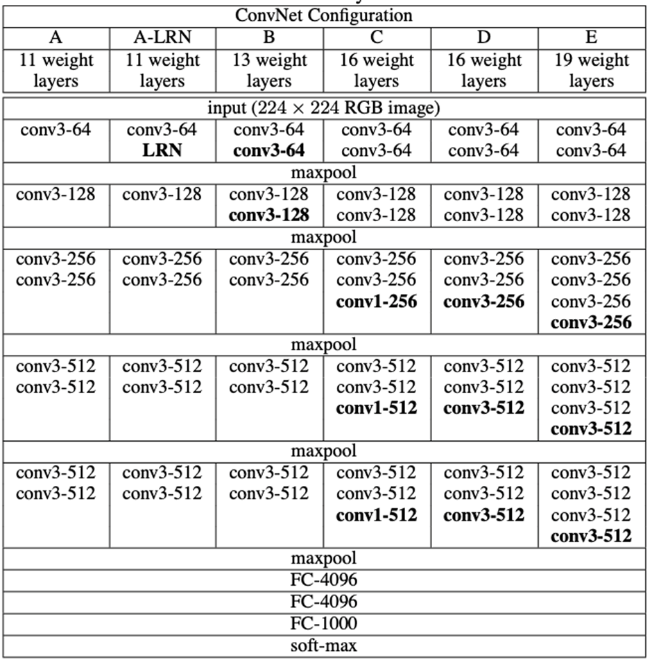 (여기서부터 의미가 이해가 잘 안감) A stack of convolutional layers (which has a different depth in different architectures) is followed by three Fully-Connected (FC) layers: the first two have 4096 channels each, the third performs 1000- way ILSVRC classification and thus contains 1000 channels (one for each class). The final layer is the soft-max layer. The configuration of the fully connected layers is the same in all networks. (컨볼루션 레이어 스택(아키텍처마다 깊이가 다름) 뒤에는 3개의 완전 연결(FC) 레이어가 이어집니다. 처음 두 개는 각각 4096개의 채널을 가지고 있고, 세 번째는 1000방향 ILSVRC 분류를 수행하므로 1000개의 채널(각 클래스당 1개씩)을 포함합니다. 마지막 레이어는 소프트 최대 레이어입니다. 완전히 연결된 계층의 구성은 모든 네트워크에서 동일합니다.)