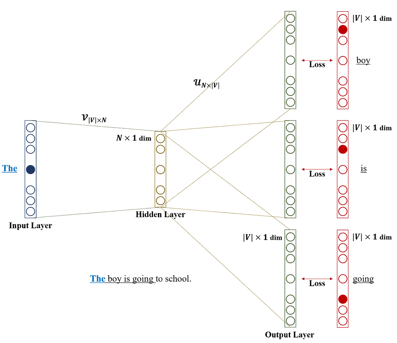 - 위 그림은, "The boy is going to school"에서 'The'를 기준단어, 'boy is going'를 문맥단어로 설정해