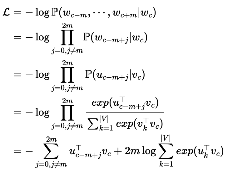 - Skip-Gram은 CBOW와 동일하게 아래 공식을 통해 가중치를 학습할 수 있습니다.