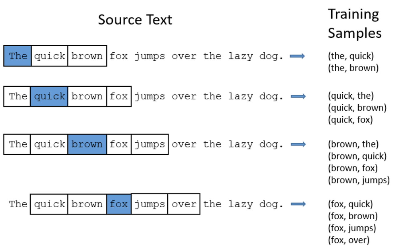 - 기준단어로부터 문맥단어를 예측하는 Skip-Gram 과정이며, 아래와 같은 순서로 진행됩니다.