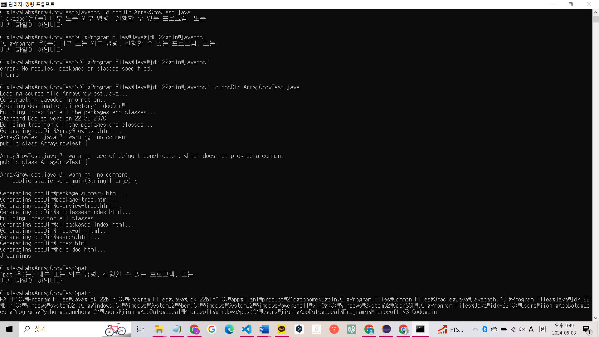 'javadoc'은(는) 내부 또는 외부 명령, 실행할 수 있는 프로그램, 또는배치 파일이 아닙니다.