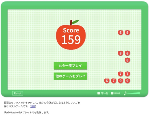 画面上をマウスでドラッグして、数字の合計が10になるようにリンゴを囲むパズルゲームです。(説明) iPadやAndroidタブレットでも動作します。