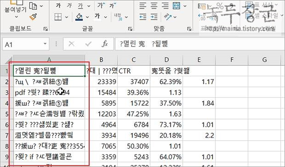 ▼ CSV 파일을 엑셀로 오픈했는데, 아래와 같이 한글이 깨져 보인다면 텍스트 인코딩 문제입니다.