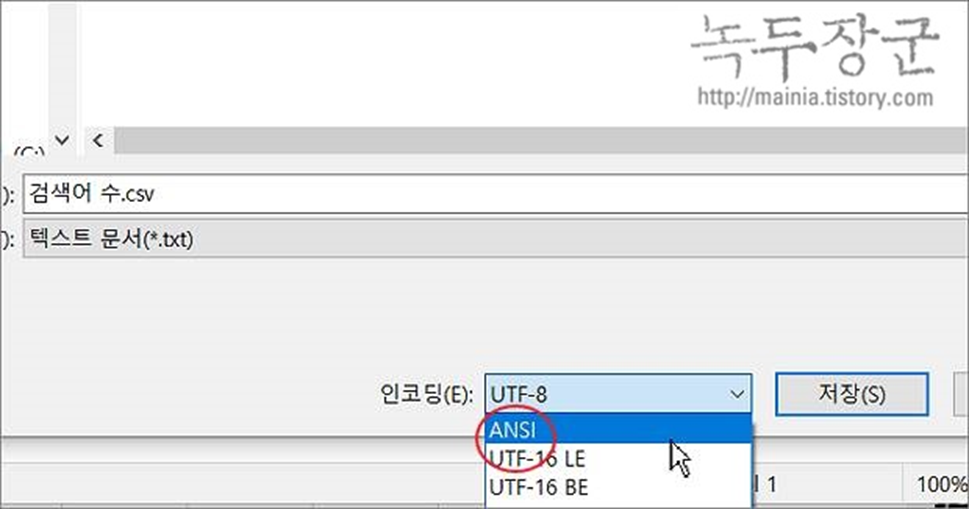 ▼ 다른 이름으로 저장 창을 열고 인코딩을 UTF-8 에서 ANSI 로 변경합니다.