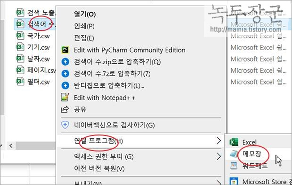 ▼ 인코딩 변환은 윈도우 텍스트 프로그램인 메모장(notepad) 를 이용할 것입니다. CSV 파일을 선택하고 오른쪽 마우스를 눌러 연결 프로그램 > 메모장을 클릭합니다.