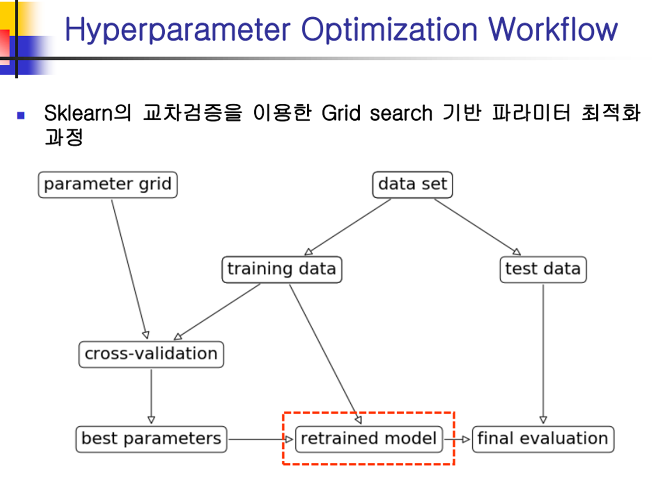 학습을 수행하기 위해 사전에 설정해야 하는 값인 hyperparameter의 최적값을 탐색하는 문 제. 여기서, 최적값이란 학습이 완료된 러닝 모델의 일반화 성능을 최고 수준으로 발휘하도 록 하는 hyperparameter 값을 의미