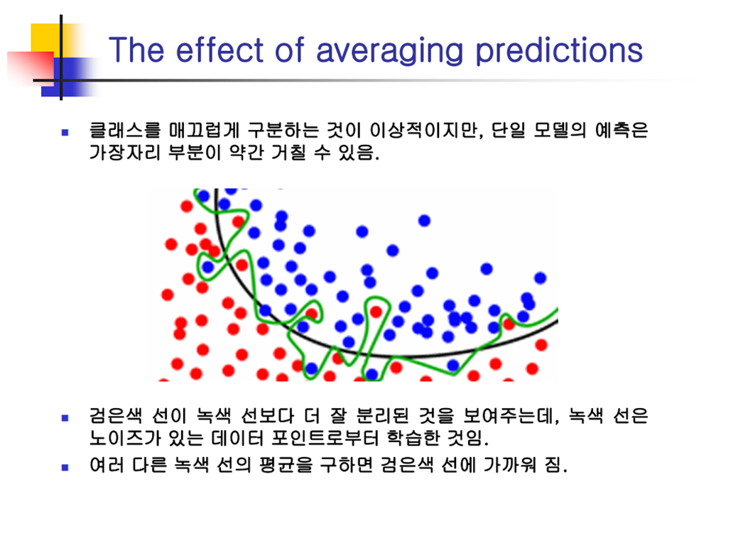 - 장점: 예측 결과의 안정성을 높여, 하나의 모델에 과하게 의존하지 않도록 도와줍니다.